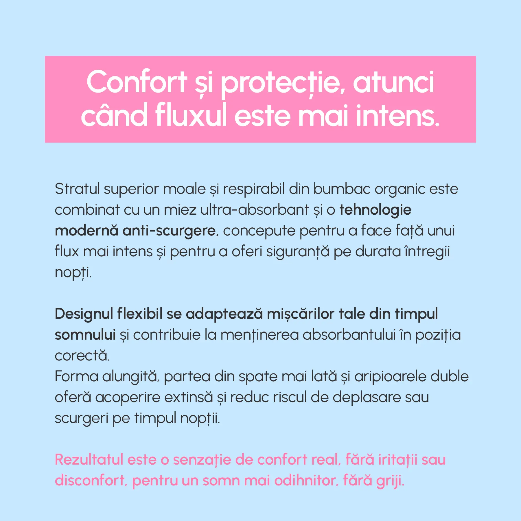 Absorbante din bumbac organic, dotate cu aripioare duble, create pentru nopțile cu flux abundent. Pentru atunci când vrei să dormi liniștită și să nu te întorci de pe o parte pe alta cu gândul „oare e ok?”.