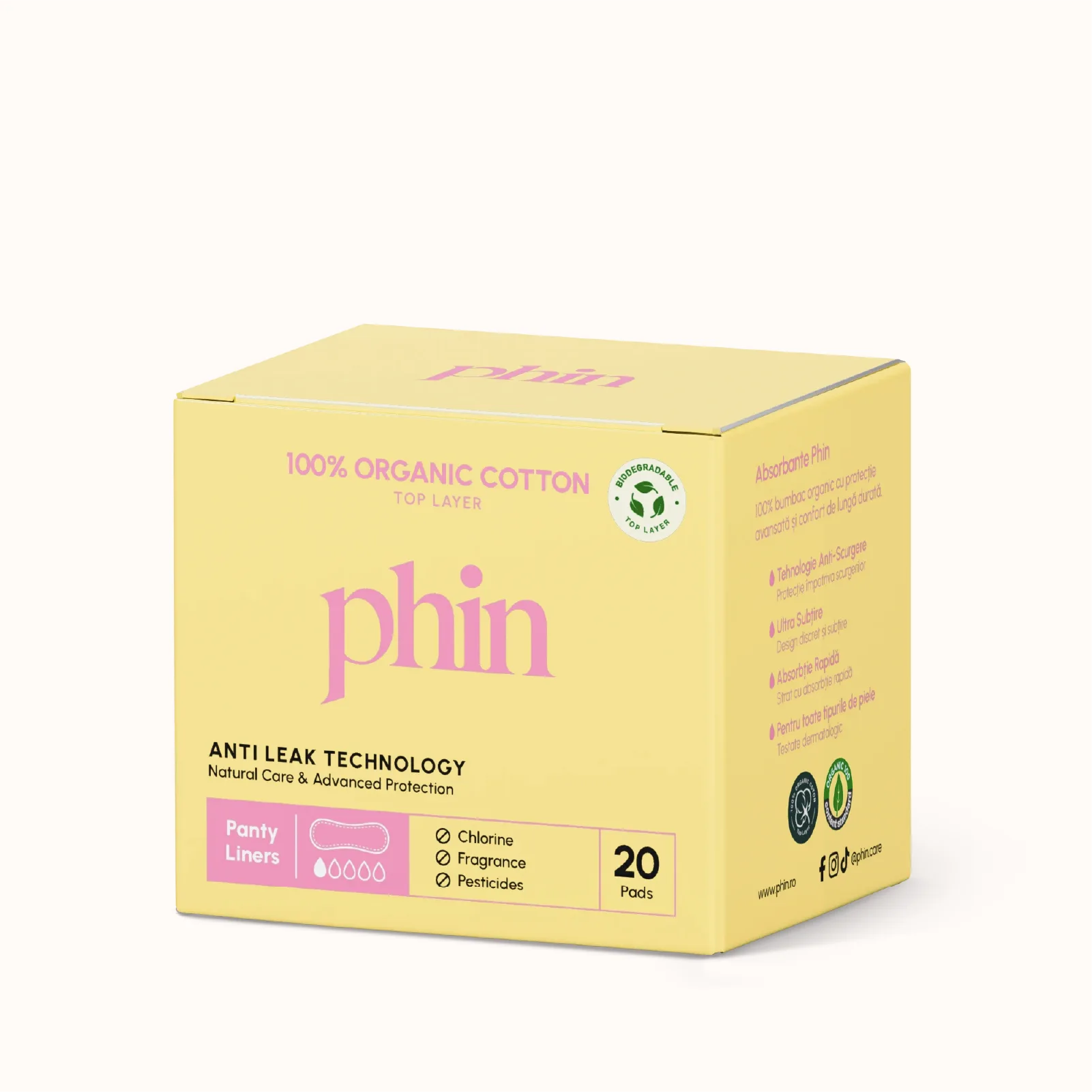 Absorbantele zilnice Phin, din bumbac 100% organic certificat fără parfum, sunt blânde cu pielea și te ajută să eviți iritațiile și mirosurile neplăcute. Exact genul de prospețime care nu se simte artificial, ci natural, normal.