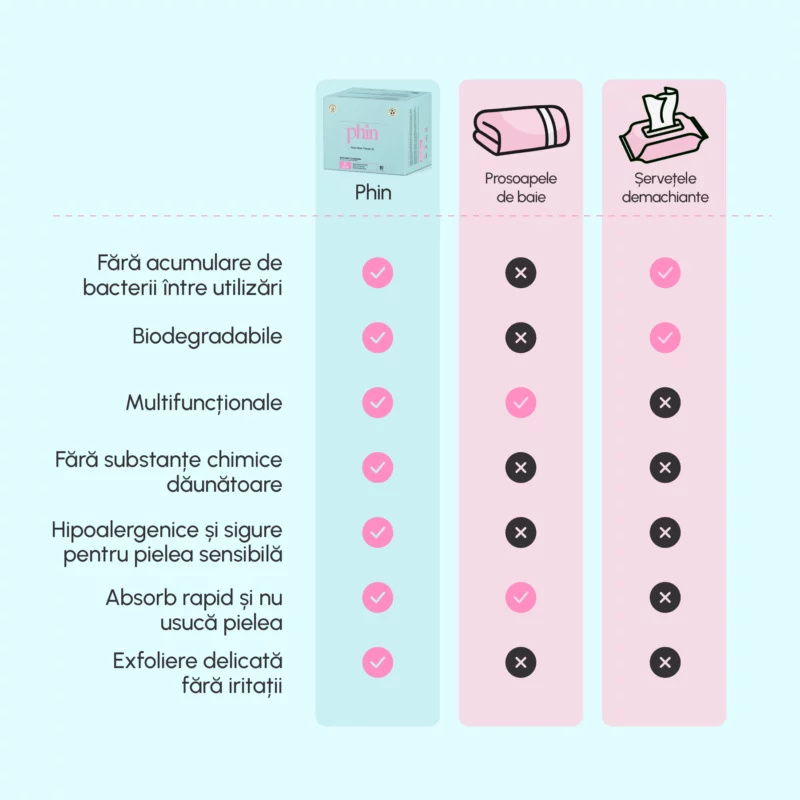 Prosoapele clasice reutilizabile pot păstra bacterii și reziduuri chiar și după spălare. Prosoapele faciale Phin Glow, de unică folosință, elimină această grijă, reducând riscul de iritații și imperfecțiuni.
